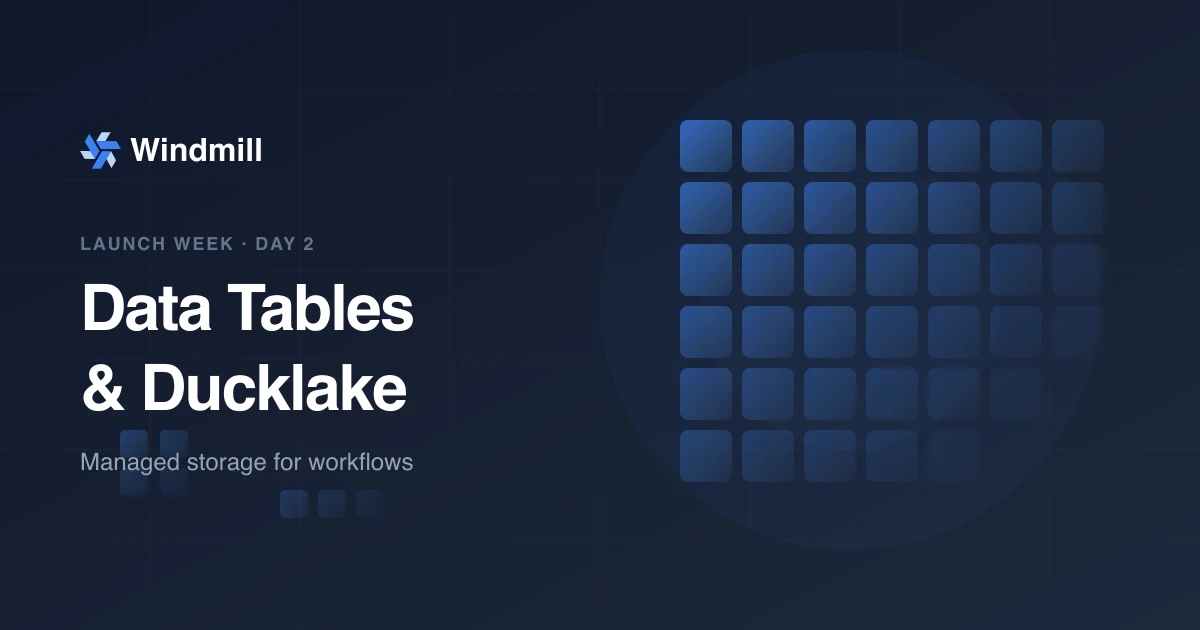Introducing Data Tables and Ducklake: managed SQL storage and S3-backed data lakehouse in Windmill.