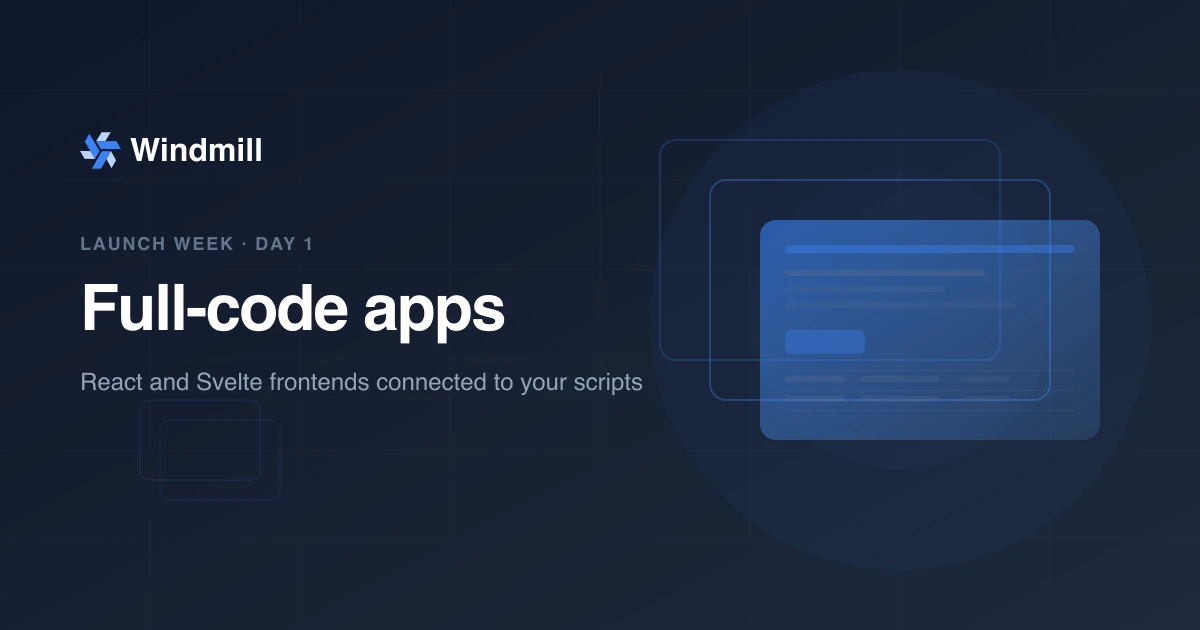 Introducing full-code apps: build React or Svelte frontends connected to backend runnables in 25+ languages, with a typed API and local dev workflow.